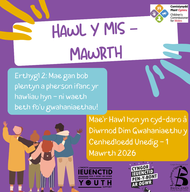 Mae’r corff hwn yn rhoi llais i bobl ifanc ym Mwrdeistref Sirol Pen-y-bont ar Ogwr. Os ydych yn dod ar draws mater pwysig sy’n effeithio ar bobl ifanc yn yr ardal, byddwn yn brwydro i fynd i’r afael ag ef.